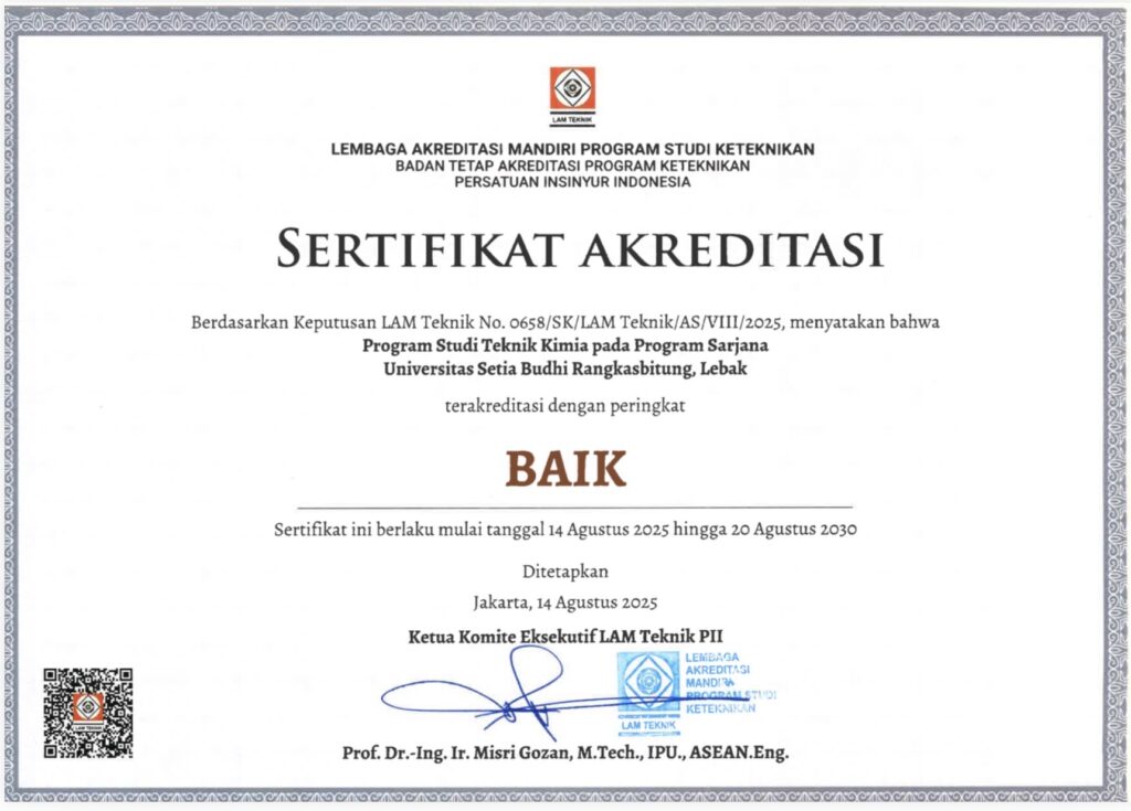 Keputusan Lembaga Akreditasi Mandiri Program Studi Keteknikan Nomor: 0658/SK/LAM Teknik/AS/VIII/2025 Tentang Peringkat Akreditasi Program Studi Teknik Kimia Pada Program Sarjana Universitas Setia Budhi Rangkasbitung, Lebak, Lembaga Akreditasi Mandiri Program Studi Keteknikan, Menyatakan bahwa Peringkat Akreditasi Program Studi Teknik Kimia pada Program Sarjana Universitas Setia Budhi Rangkasbitung, Lebak, memenuhi Peringkat Akreditasi Baik.